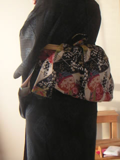 帯結びは割り角だしの変形です。背中にぴょこっと飛び出た部分を花のようにしているのですが、写真の角度だとよくわからないなぁ。残念。