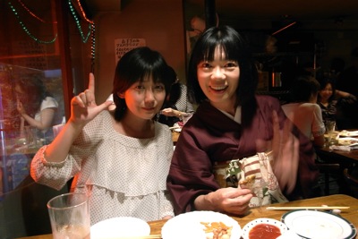 写真は、黒地に赤い細縞のきものがイカすケイちゃんと、最近えらく若返っているさとみちゃん。と、ビールが効いてへらへらしている私。いい夜でした。