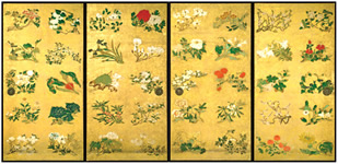 6畳ほどの小さな部屋の、金色に塗られた四方の壁の床から天井までが花、花、花。グリッド上に整然と描かれたリアルな花たちは美しさだけでない凄みすら醸し出していて、ただただ圧巻。願わくば部屋の中に入り込んですべての襖を閉め切ってみたいものだけど、それは無理なので柵から身を乗り出して精一杯のぞき込みつつ若沖ワールドを堪能。